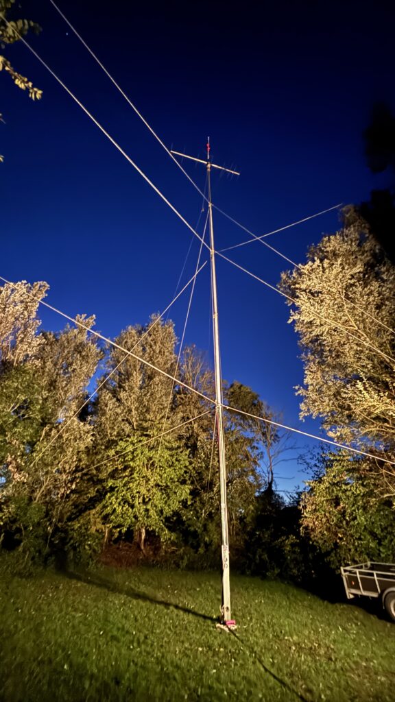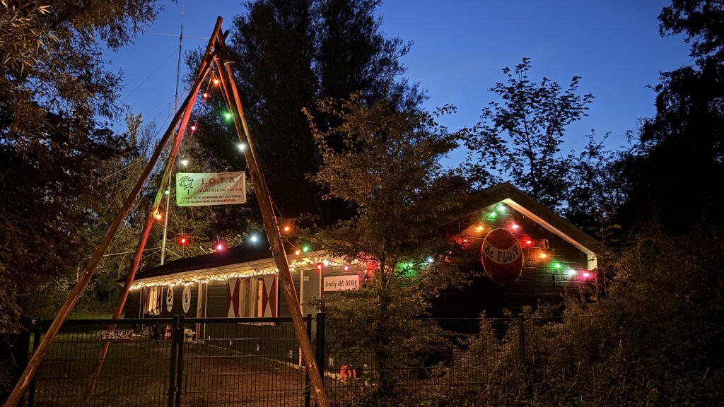 Vrijdagmiddag 18 oktober is de opbouw van de JOTA begonnen. De mast werd opgetuigd, de zender uitgestald en de lampjes werden opgehangen. De opbouw verliep voorspoedig en in tegenstelling tot voorgaande jaren waren we nu al om 18:30 uur helemaal klaar en konden we rustig van onze nasi genieten. De laatste hand werd gelegd aan de toegangspoort en er was zelfs nog tijd om een deel van de F1 te zien op het grote scherm. Het wordt een mooi weekend met een leuk programma.
